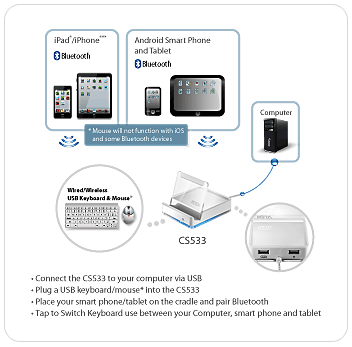 Теперь нет необходимости покупать Bluetooth-совместимые клавиатуры или мыши, CS533 также экономит место на столе. CS533 не требует дополнительной установки драйверов или программного обеспечения. CS533 имеет удобный дизайн в виде подставки для смартфона или планшета. CS533 даёт возможность устанавливать устройства под углами, 70° или 20°, для удобства работы с ними. Резиновые ножки удерживают устройства от перемещения и скольжения.