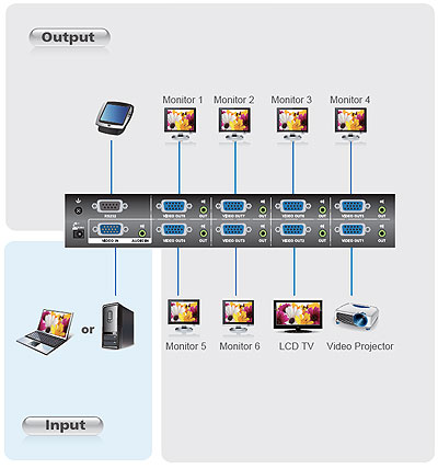VS0102/VS0104/VS0108 — это аудио/видео разветвители, которые позволяют один VGA видеосигнал и один звуковой канал, размножить на 2/4/8 выходов соответственно, чтобы пордключить до 8 мониторов со стереозвуком. Разветвители поддерживают частоту видео до 450 МГц, что означает поддержку видеоразрешений до 1920х1440.