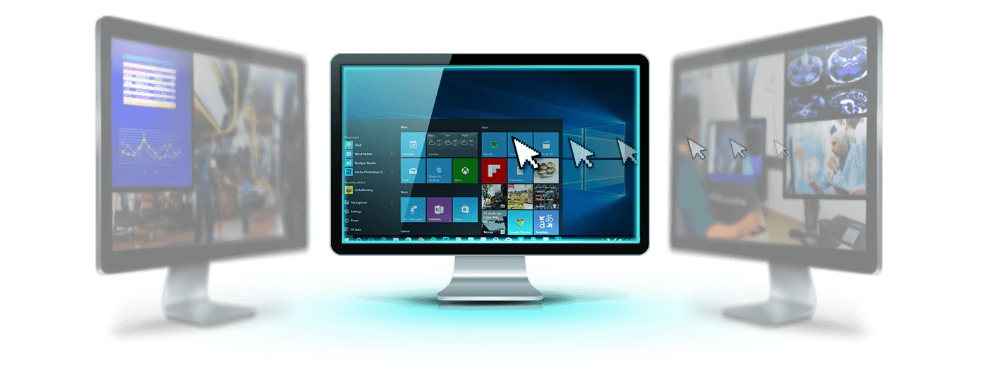 | Мультидисплейное переключение (отображение нескольких рабочих столов на нескольких мониторах) | Мультиоконное переключение (отображение нескольких рабочих столов на одном мониторе) |