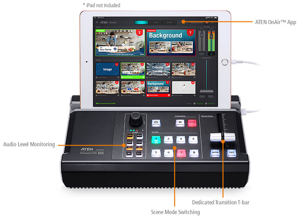 Ваш iPad станет Вашей личной аппаратной для видеомонтажа. С помощью приложения ATEN OnAir™ Вы можете оформить и настроить до 8 пользовательских сцен, используя интуитивно понятный интерфейс и специальный редактор сцен. Комбинируйте, обрезайте и масштабируйте изображения, чтобы сделать разнообразные макеты. Добавьте прозрачные изображения в формате png, фоны и наложения текста с эффектами, позволяющими создать профессиональное видео. Можно экспортировать предустановки сцен, а также и поделиться ими с сообществом, использующим другие системы StreamLIVE™ HD.
