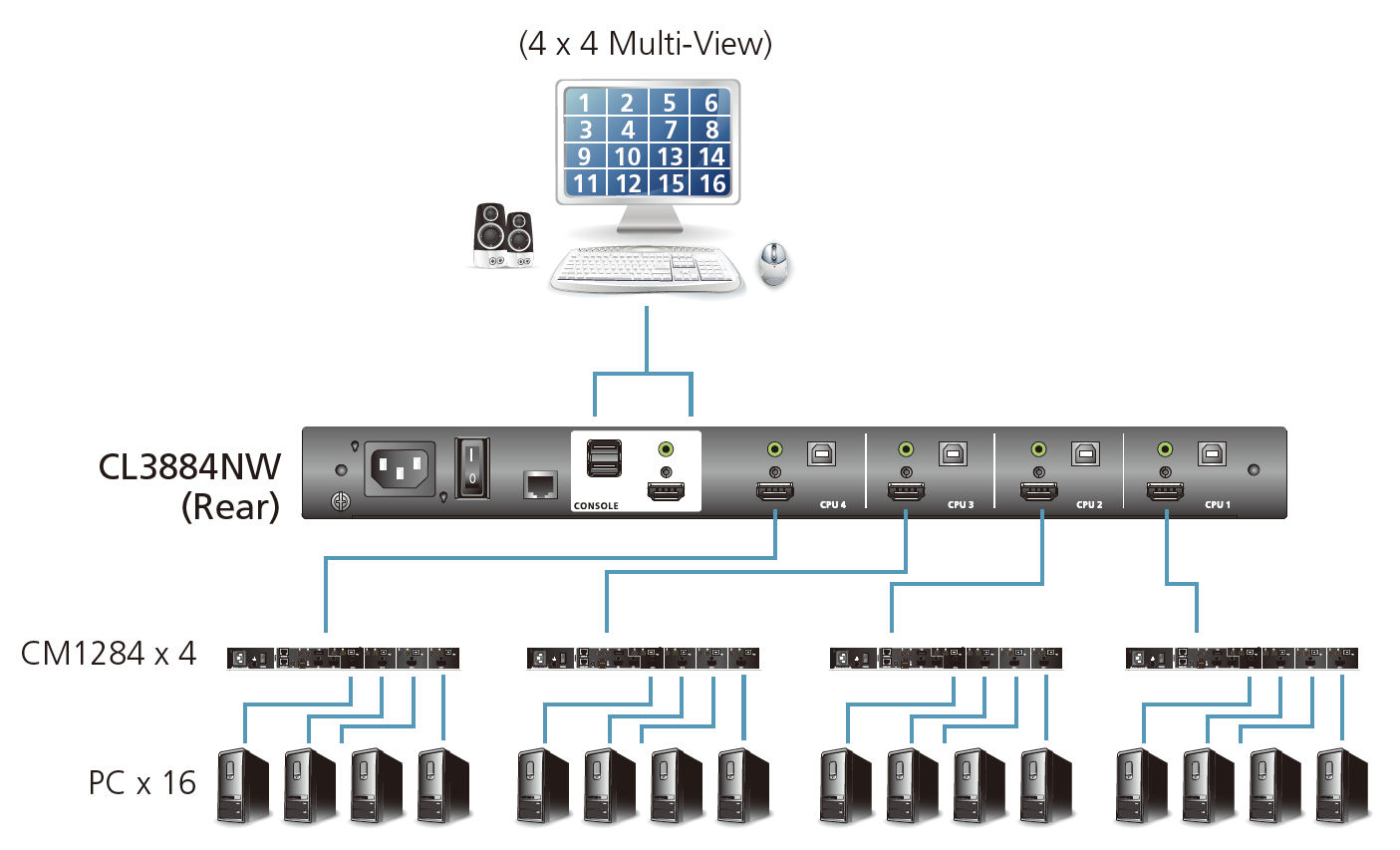 CL3884NW при каскадном подключении 2-го уровня KVM переключателей (CM1284) может поддерживать до 16 видеоисточников, сигналы с которых могут одновременно отображаться на экране CL3884NW и управляться с независимых консолей (клавиатура и мышь).