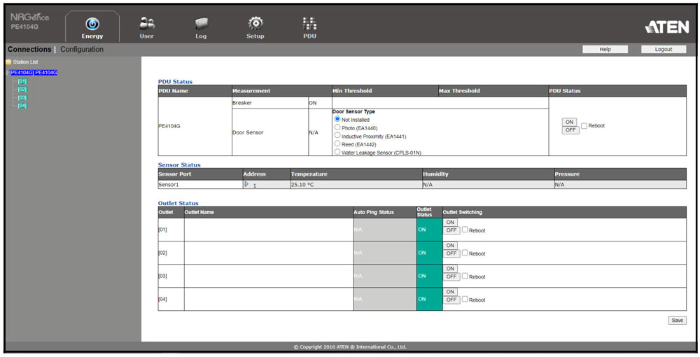 PDU поддерживает V3 SNMP Manager, SMTP-сервера и Syslog Server, благодаря чему вможно управлять устройством, организовать оповещения по электронной почте, когда пороговое значение превышает минимальное или максимальное значение, и вести системный журнал событий.