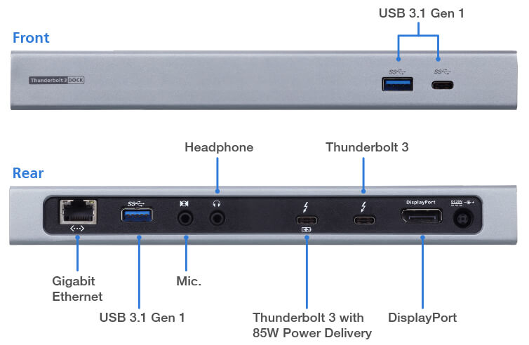 - Поддерживает через один кабель Thunderbolt™ 3 протоколы Thunderbolt™ 3 (40 Гбит/с) и USB 3.1 Gen2 (10 Гбит/с)