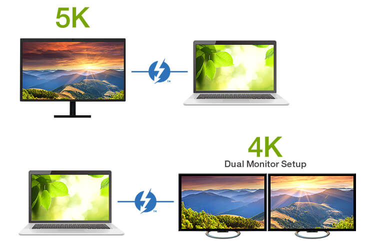 - Поддержка 5K-разрешения на одном дисплее Thunderbolt™ 3 или двойного подключения в 4K-разрешении, с одним дисплеем DisplayPort и одним дисплем USB-C/Thunderbolt™ 3