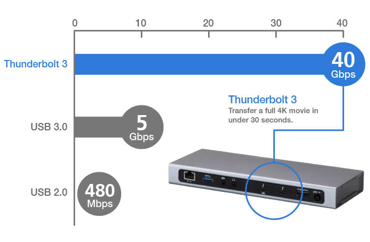 Благодаря феноменальной пропускной способности Thunderbolt ™ 3 до 40 Гбит / с передача фильма в разрешении 4K. занимает менее 30 секунд. Это означает, что вы можете быстрее передавать файлы, сокращать ожидания и выполнять больше за один и тот же промежуток времени.
