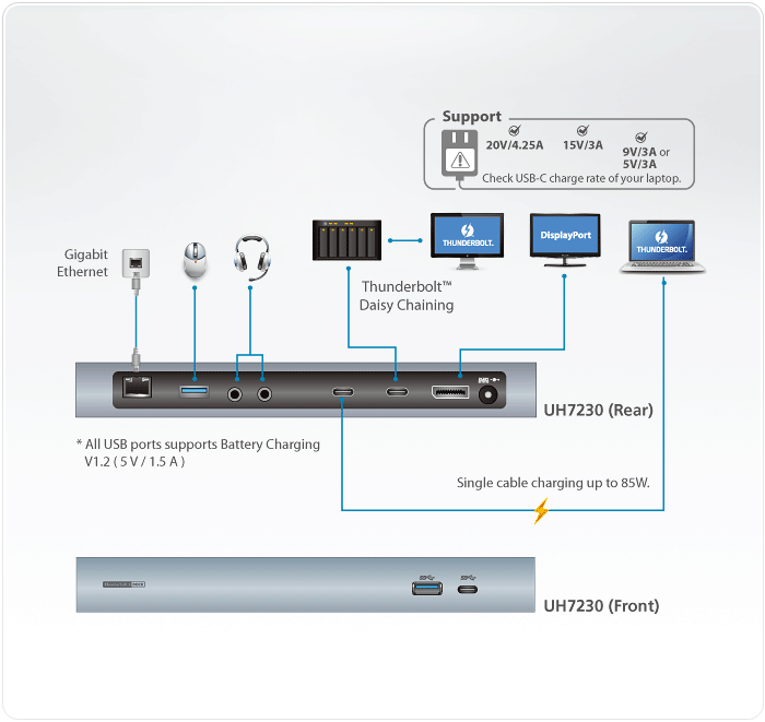 UH7230 - имеет функию зарядки вашего ноутбука и USB-аксессуаров. Он поддерживает до 85 Вт питания для ноутбуков Mac или Windows.